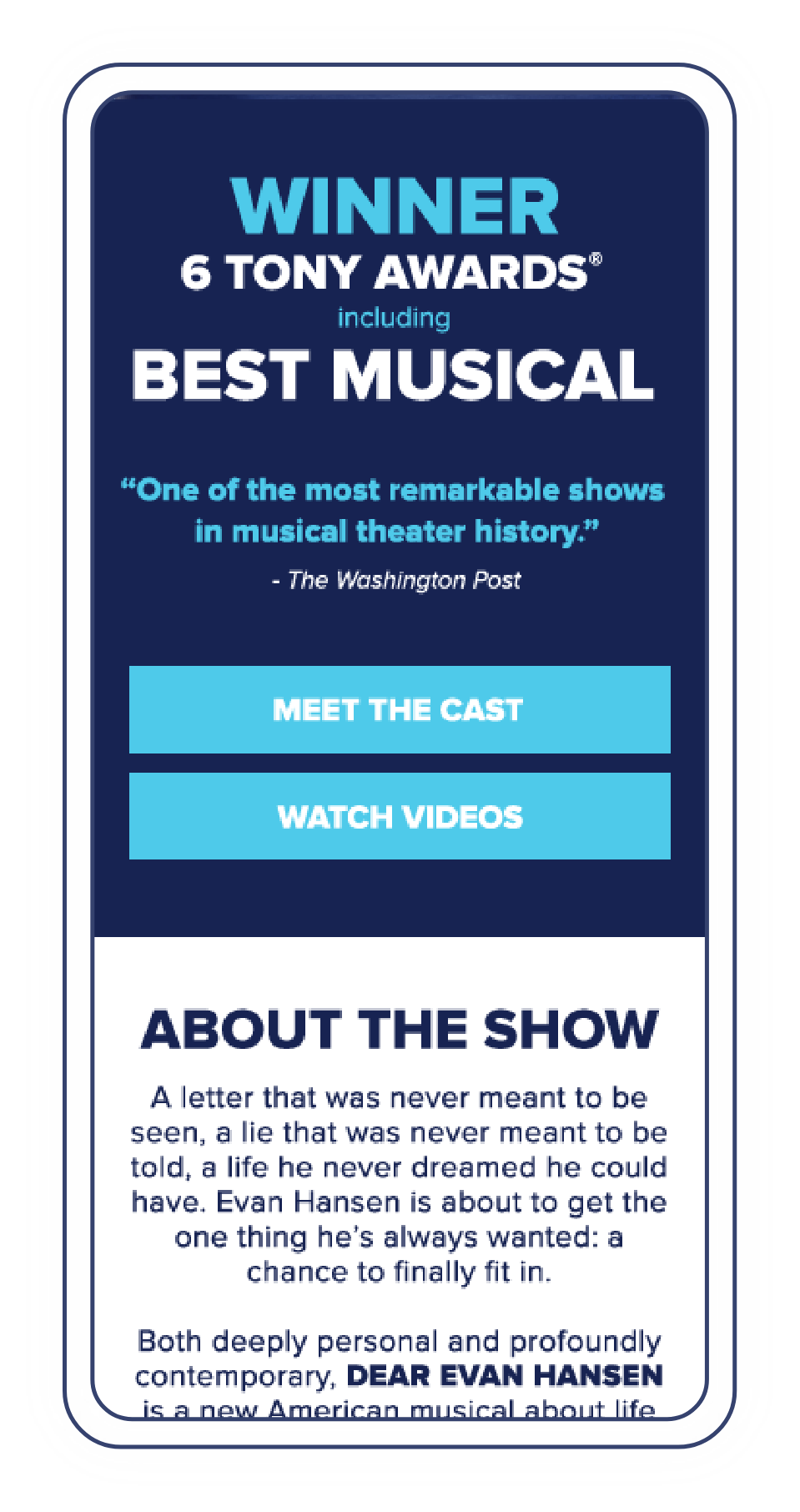 This Tony-Award winning musical for Best Musical needed a strong digital presence through the run of their show. You’ll find website design and iOS stickers for Apple. Numerous social campaigns were created to target varying localities, such as the NYC Metropolitan area, as well as the tour markets to best represent our show’s brand outside of New York.